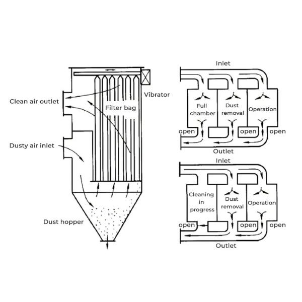 - バッグの種類: フィルターバッグの素材 (織物やフェルトなど) は、粉塵の種類と動作条件に基づいて選択されます。たとえば、乾いた粉塵にはポリエステル製バッグを使用し、高温用途にはノーメックス バッグを選択できます。
